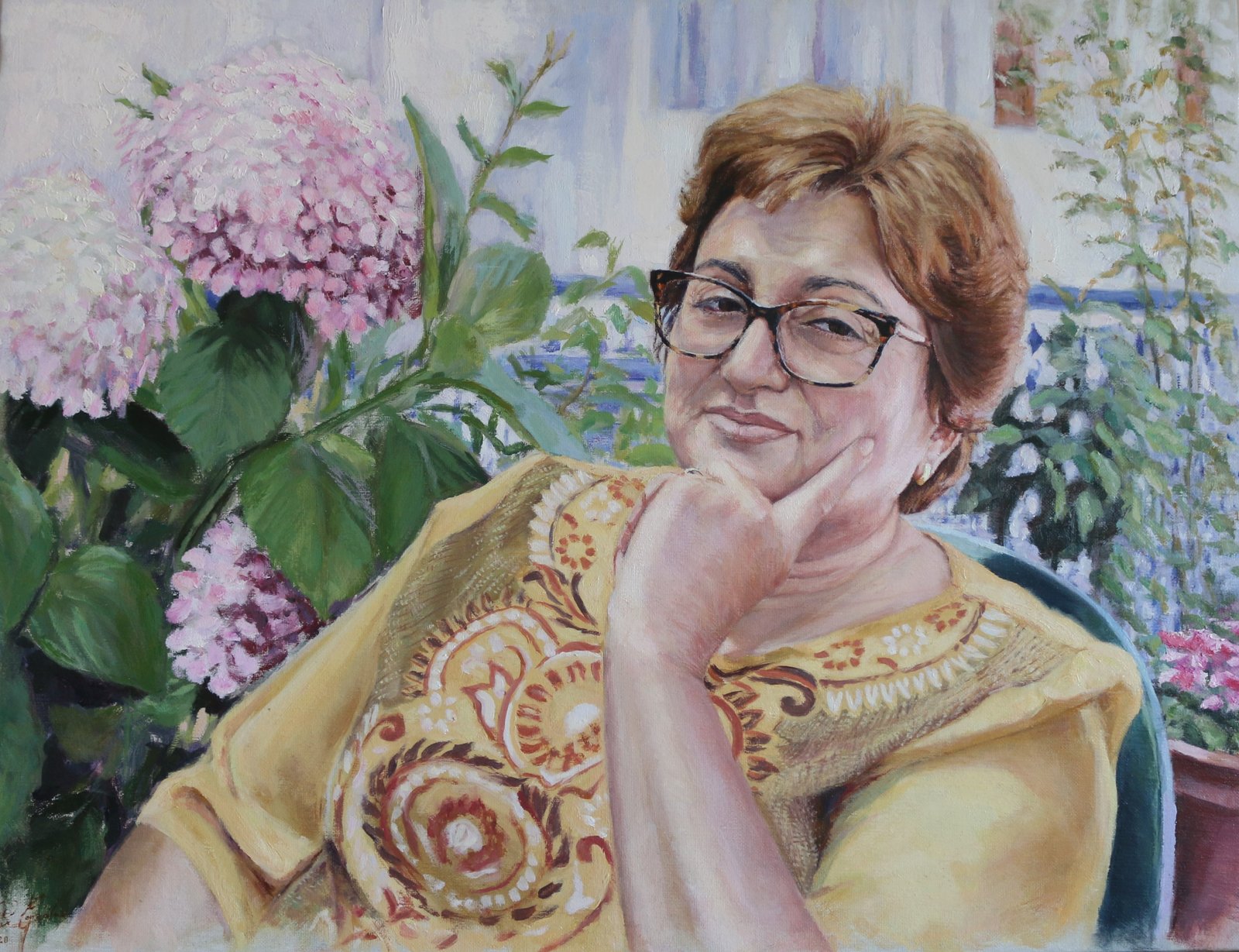 Mi madre en su jardín junto a sus hortensias , que mejor retrato que pintar a tu madre , esta pintura refleja su naturalidad y luz en su entorno junto a sus plantas.