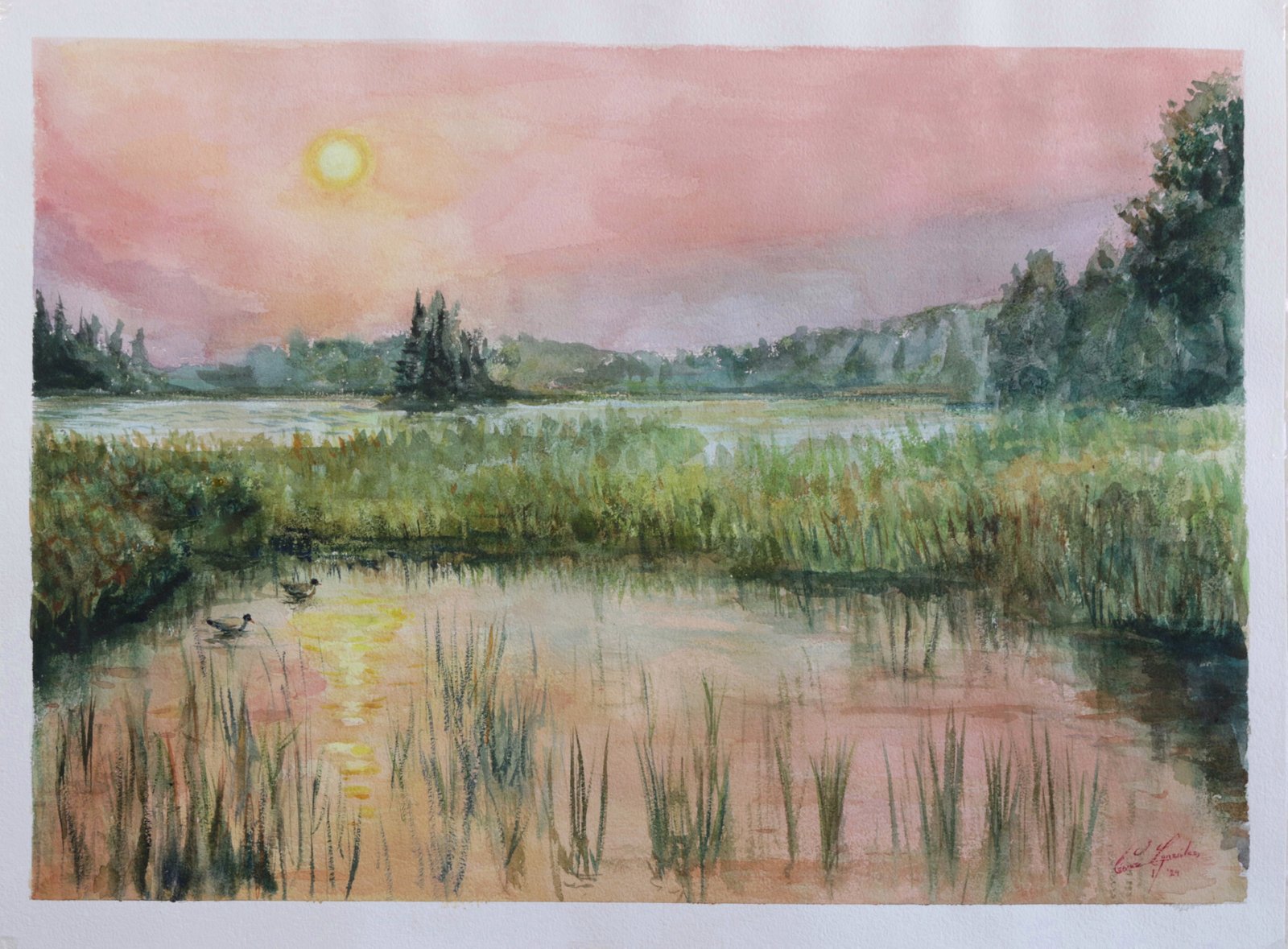 La atmosfera y naturaleza en el atardecer creando una amplia gama cromática y reflejos en el estanque.