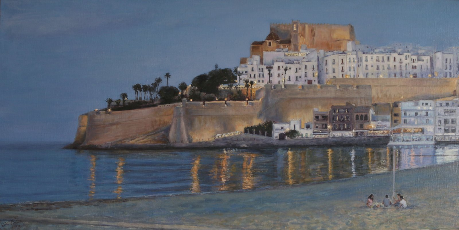 PeñíscolaPaisajes Óleo sobre lino 100 x 50 cm Peñíscola al caer la tarde y encenderse las luces creando reflejos en el mar, con unos niños sentados en la playa.
